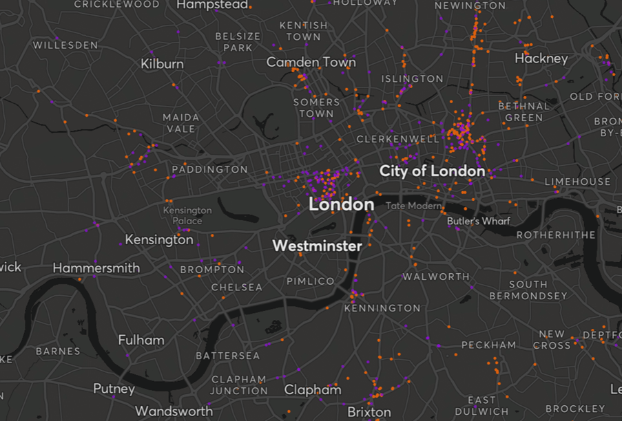 Each dot on the map above represents a nightclub. The orange dots show open clubs, the purple dots, closed. This map is from 2016. As can be seen, the lack of clubs in West London is an issue older than COVID. COVID of course has not helped; the small number of West London clubs displayed above have largely since closed, although this may be related to other factors.